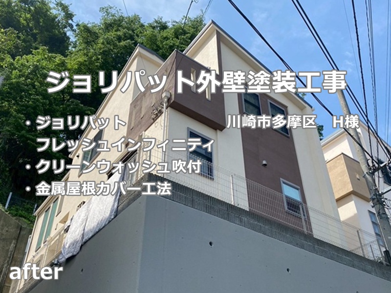 川崎市多摩区のお客様より、ジョリパット外壁塗装、付帯部塗装、金属屋根カバー工法、擁壁塗装のご依頼をいただきました。