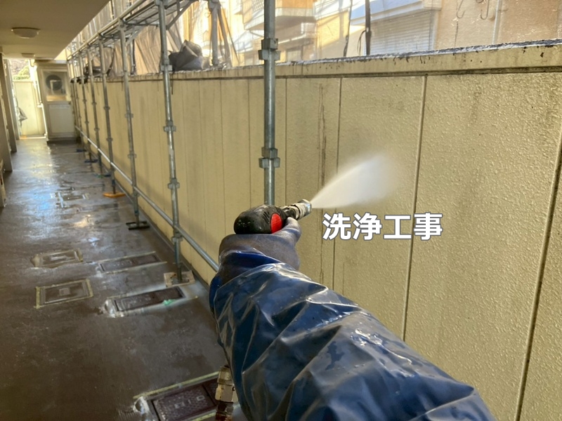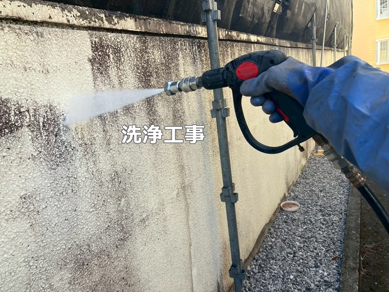 塗装のため部分足場を設置し、洗浄を行います。
