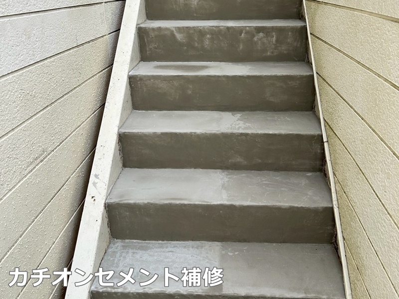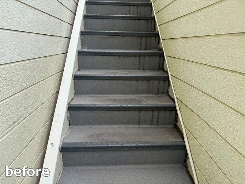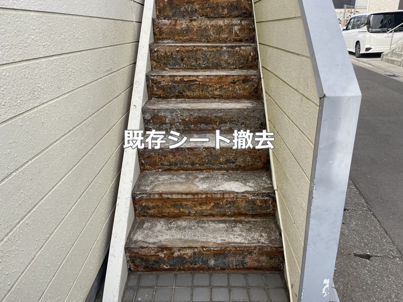 階段は、既存ステップ除去、カチオンセメント補修後、タキステップを張り込みます。