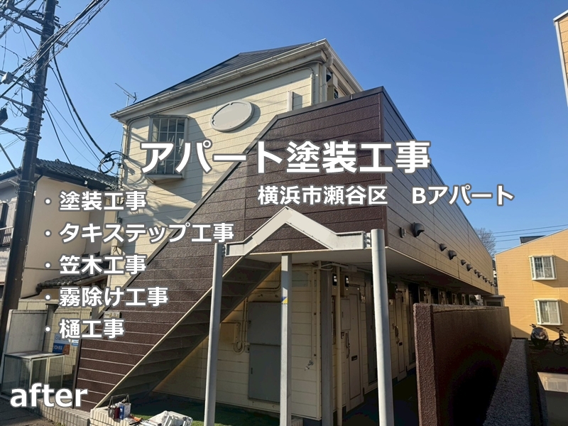 横浜市瀬谷区のお客様より、アパートの塗装工事、付帯部塗装、笠木工事、タキステップ塗装、樋交換のご依頼をいただきました。