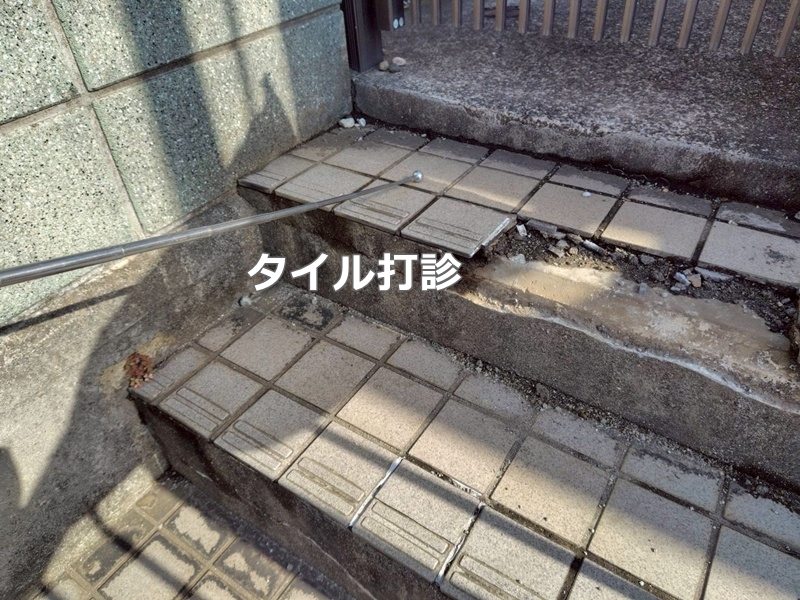 タイルの打診検査を行い、浮いているタイルはハツリを行いました。