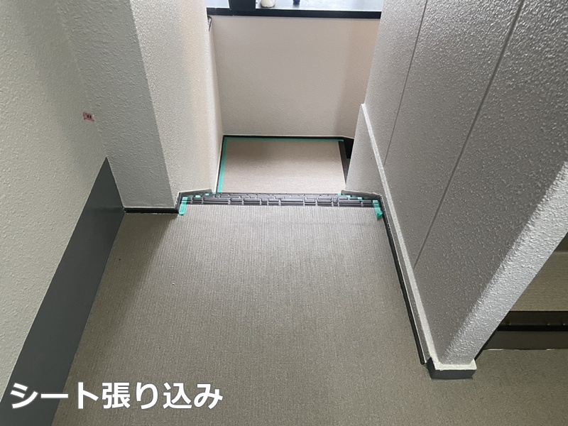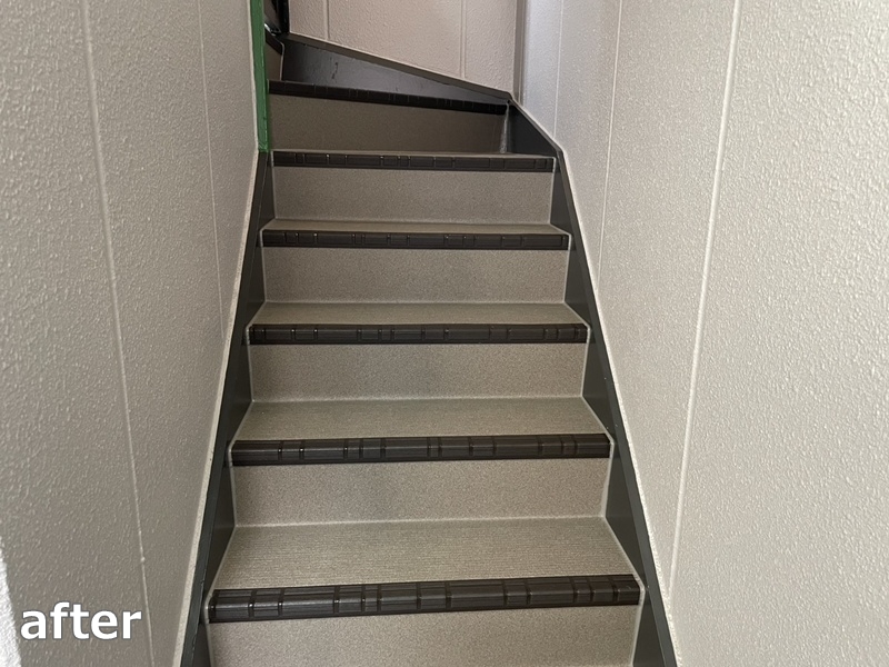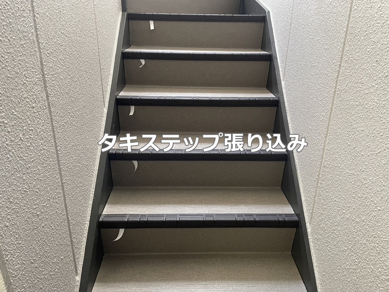 階段、踊場は巾木のウレタン防水、ササラ塗装を行い、タキステップ8Wを張り込みました!